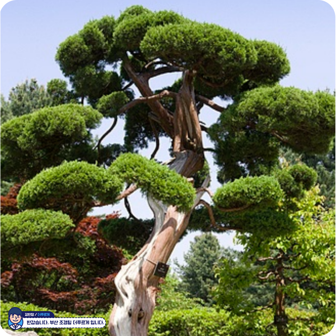 가이즈카향나무의 진정한 매력은 비틀린 듯한 곡선의 수형미입니다. 단독 식재 시엔 포인트 나무로, 여러 그루를 심으면 고급 그린월로 연출 가능합니다.